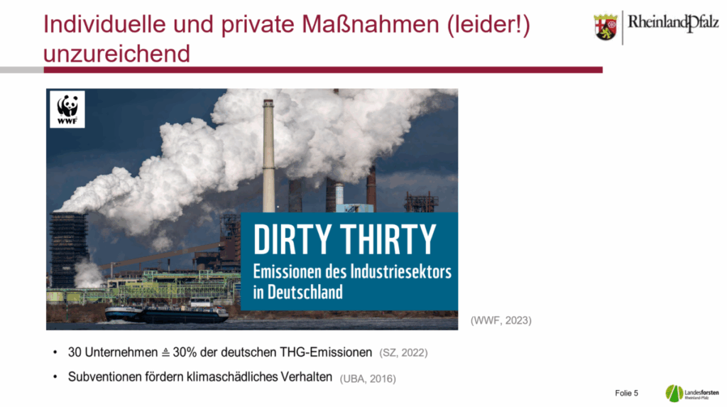 Die restlichen 6 t an Reduktion müssen wir durch politisch gesteuerte Maßnahmen, durch sogenannte public sphere actions, den die großen Treibhausgas-Emittenten sind nicht die transformationsbereiten Individuen, sondern der Energie- und Industriesektor: