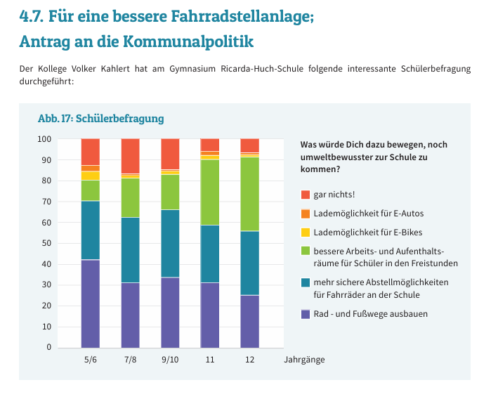 Wer mit seinen Schülerinnen und Schülern Anträge an Entscheidungsträgerinnen und -träger stellen will, die das Fahrradfahren fördern können, findet in der Broschüre „Auf dem Weg zur klimaneutralen Schule“ vom OEKOM-Verlag (kostenloser Download) sehr gutes, datenbasiertes Material (Auf dem Weg zur klimaneutralen Schule | oekom verlag):