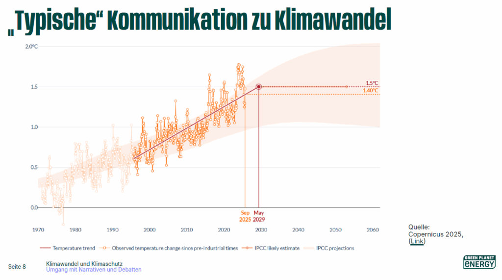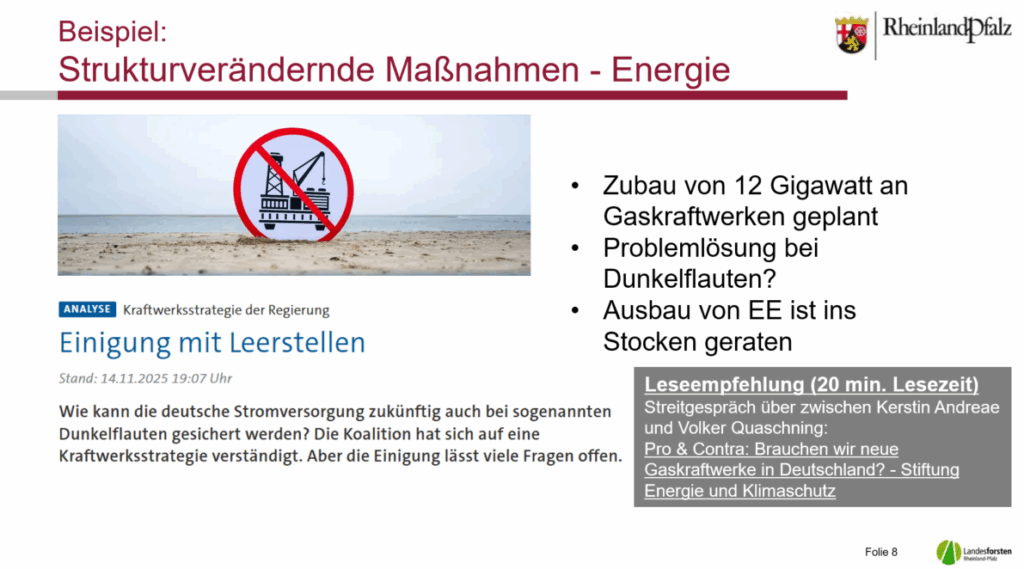 Johanna Kranz‘ Folien verwiesen auf offene Baustellen der deutschen Klimapolitik, die man in der Schule mit Schülerinnen und Schülern besprechen sollte, so z.B. den Streit um die weitere Ausgestaltung der Energiewende, denn der Ausbau der Erneuerbaren Energien ist durch den Regierungswechsel in Berlin ins Stocken geraten:
