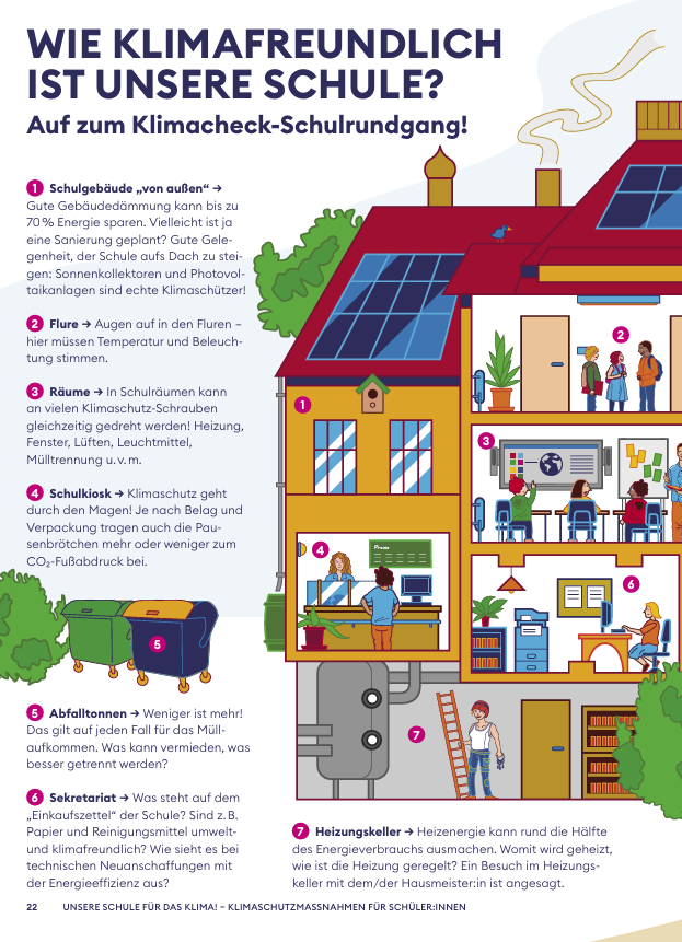 Die Broschüre „Unsere Schule für das Klima“ von Greenpeace enthält z.B. eine gut handhabbare Anleitung für die Analyse der eigenen Schule in Hinblick auf mögliche Klimaschutzmaßnahmen: