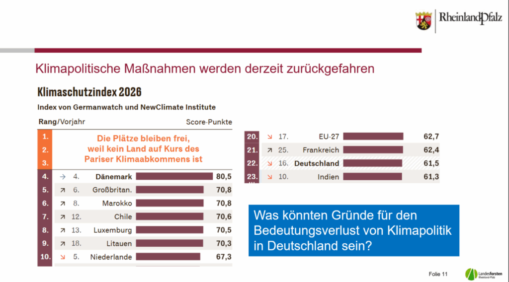 Deutschland ist weit zurückgefallen, was Klimaschutz anbelangt. Andere Länder sind da viel weiter als wir, so die These von Johanna Kranz, die sie mit aktuellen Belegen gut und plausibel begründen konnte.